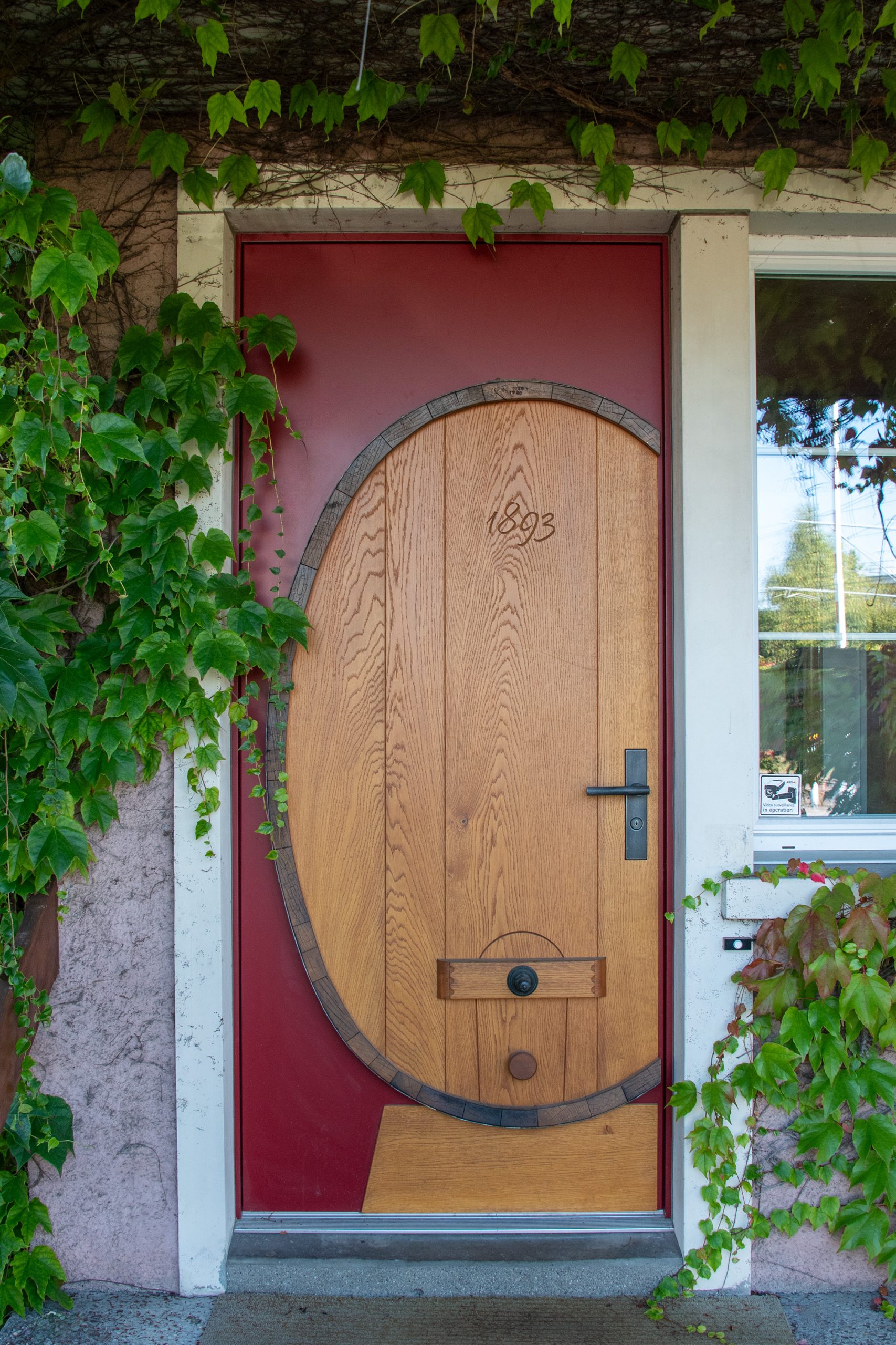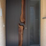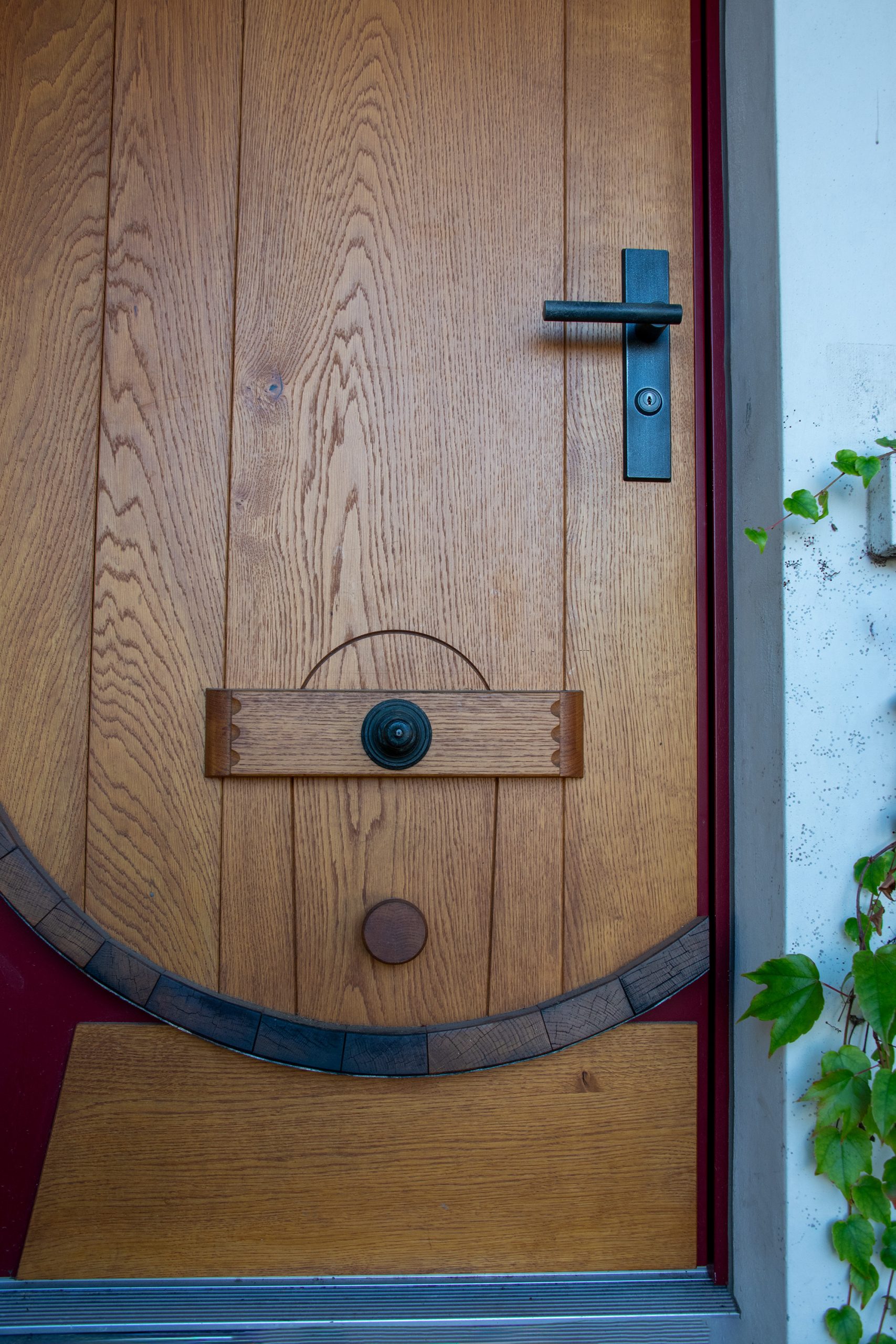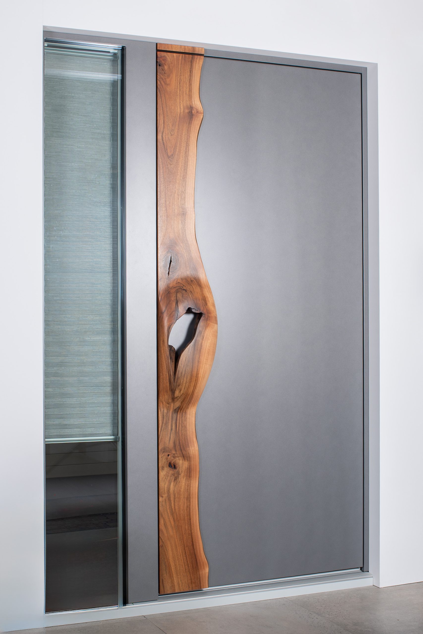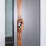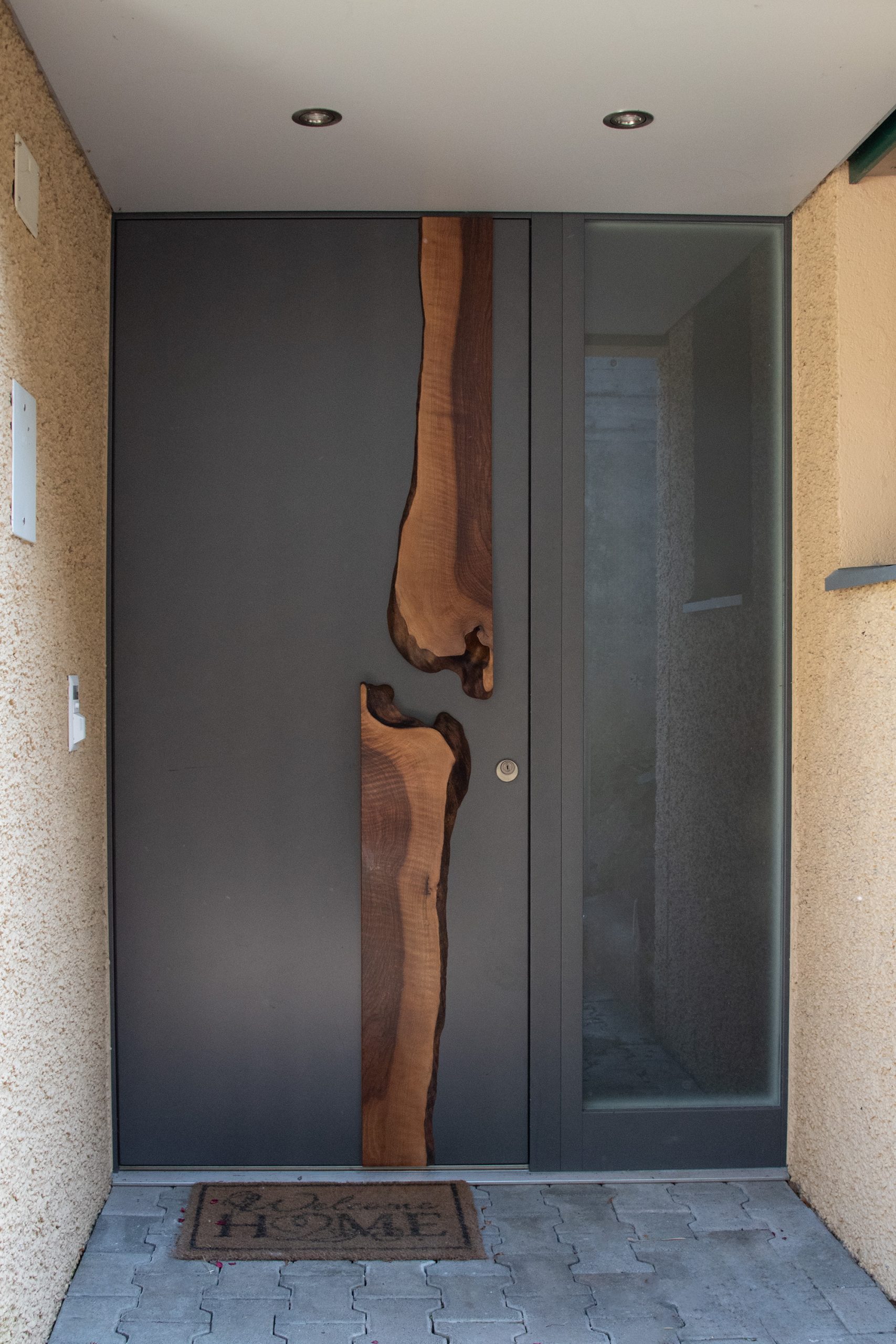 «Erstens kommt es anders und zweitens als man denkt.» Dieser berühmte Spruch wird Wilhelm Busch zugeschrieben und ist bei dem Nussbaumbrett, das diese Haustür ziert, ziemlich treffend. Denn das Aufsägen des Stammes lief nicht ganz nach Plan, wie sich Peter Rösch, Geschäftsführer der Nerozzi + Rösch AG erinnert: «Im Holz steckte ein Nagel, und das deswegen stumpfe Sägeblatt ist an dieser Stelle so stark verlaufen, dass wir den Rest mit der Kettensäge auftrennen mussten.» Die daraus resultierenden Dickendifferenzen zusammen mit einem grossen Astausbruch im Brett inspirierten die Schreinerei in Nesselnbach AG zu diesem Türdesign. Der vermeintliche Holzfehler bildet nun das Griffdetail der Haustür. In dem Bereich ist das Brett ausreichend dick, um Platz für die Hand und einen Fingerabdrucksensor zu bieten. In einem fliessenden Übergang verjüngt es sich zu den Enden hin auf rund 20 mm Dicke.